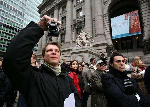 Vladislav Prokopov of Russia, left, a student at Mansfield University in Pennsylvania takes a picture while standing in front of the former US Custom House during the 20th annual guided walking tour of Lower Manhattan in October. Associated Press