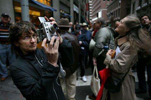 Maria Teresa Cometto of New York takes a picture at William and Beaver Streets in New York during the 20th annual guided walking tour of Lower Manhattan last month. Associated Press