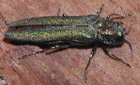 The adult emerald ash borer is a half-inch long metallic green beetle that is native to Asia. Its larvae burrow into the bark of ash trees, causing the trees to eventually die.