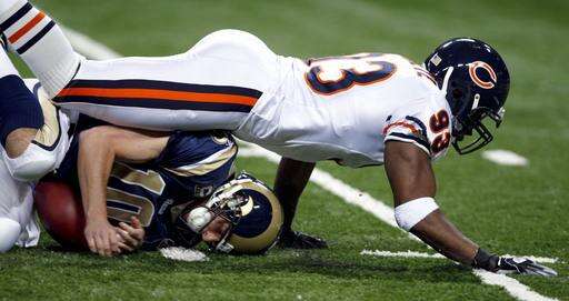 The pass rush that had been missing for more than a month finally reappeared. The 5 sacks were as many as they had in the five previous games ... combined. Left end Adewale Ogunleye and left tackle Tommie Harris, who had combined for just 41/2 sacks in the first 10 games, had 2 each against the Rams.