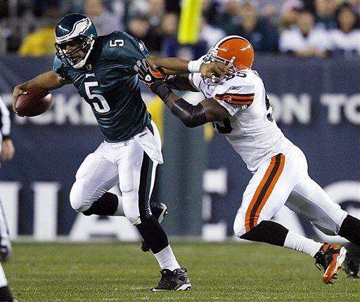 Philadelphia Eagles quarterback Donovan McNabb tries to break away from Cleveland Browns linebacker Willie McGinest in the second quarter Monday, Associated Press