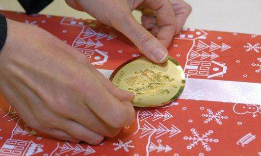 A gold seal covers the tape, and a gift tag is slipped beneath the ribbon. And that's it: one minute, five seconds.