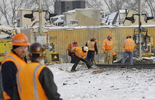 Workers fix the train crossing at Terry Avenue in Aurora after a multiple train car derailment early Thursday morning. Laura Stoecker | Staff Photographer