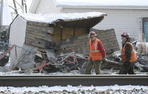 Workers with Hulcher Professional Services walk past the shed that was demolished and came within a few feet from a home after the rail car was removed from a multiple car derailment in Aurora. This is located west of the train crossing at Terry Avenue. Laura Stoecker | Staff Photographer