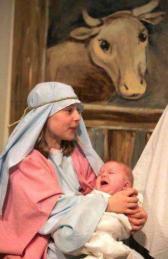 Jesus (4-month-old Joey Amsler) didn't actually spend any time Saturday morning in the hay-lined manger. He was passed back and forth between Matt and Ellie Tate, 10, of St. Charles, who played Mary.