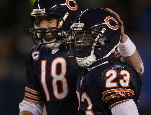 Quarterback Kyle Orton and receiver Devin Hester celebrate the interference call against the Saints that set up the winning field goal in overtime. George LeClaire | Staff Photographer