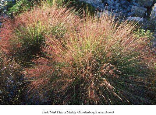 •When we're talking grasses Pink Mist Plains muhly is showy with reddish-pink seed heads. It needs sun and it doesn't like a lot of moisture. High Country Gardens.