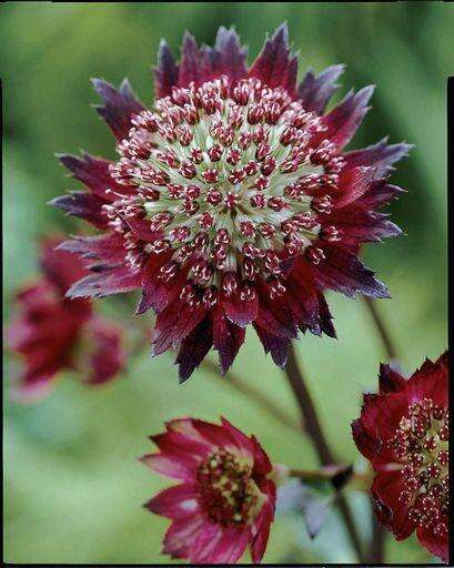 •Astrantia Moulin Rouge is exotic and grows 18 inches tall with some shade. Burpee.