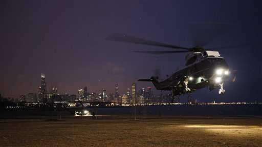 It was not going to be possible, however, for Obama be an average Joe. After arriving at O'Hare airport aboard Air Force One, Obama, his aides and press corps got into Marine helicopters and clipped through downtown Chicago and landed at a park on Lake Michigan near the president's home.