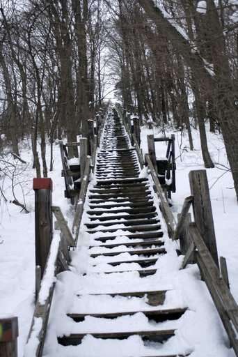 "There's a lot of resting spots on the way up, and I used every one of them," he says with a laugh. The snow on the steps makes for an even more challenging hike than during warmer weather to the top of the dune, where there is a large observation deck and a bird's-eye view of the area's scenic beauty.