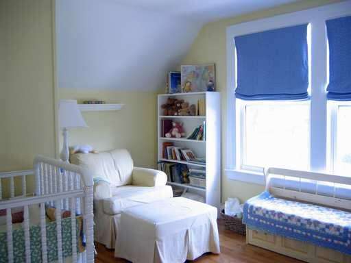Next to it, we placed an easy chair and ottoman, which four years ago had been a nursing chair. Inexpensive dye changed the slipcover from now-faded yellow to coordinating green.