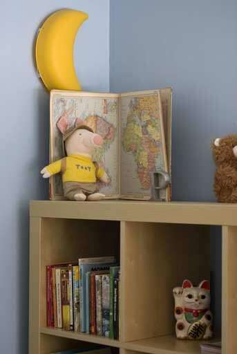 We also got bargains online. The prints were affordable on etsy.com, and we used a coupon to get a discount on the frames. On Craigslist, we found two small wall shelves for next to the bed. They were the same Pottery Barn shelves we'd liked in the catalog, but for $10 instead of $100. Sure, they were pink, but $3 for a can of blue spray paint made them a great find.