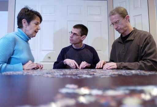 Chip Davis, center, works on a puzzle with his mother Pam Nass and stepfather Drew Nass in their Sugar Grove home. Mary Beth Nolan | Staff Photographer