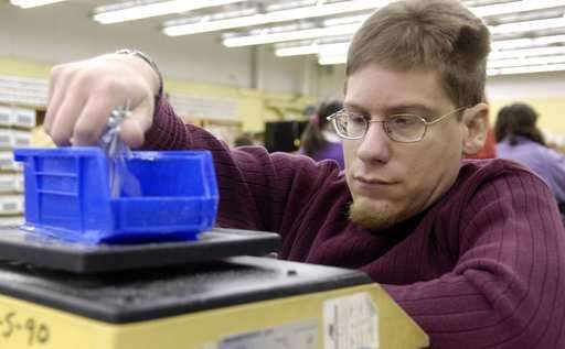 Brad Torrence weighs nails as part of his job at the AID facility in Aurora. He is on an 850-person waiting list for people seeking placement in group homes in Kane County. Rick West | Staff Photographer
