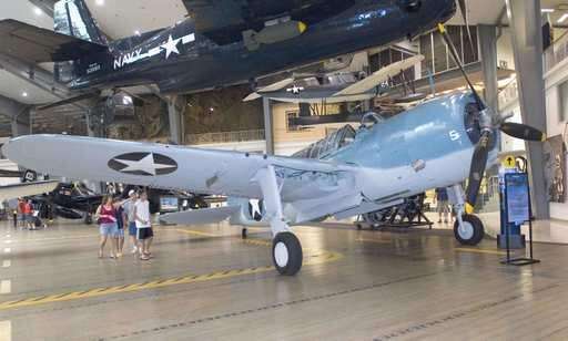 Visitors to the National Museum of Naval Aviation last summer look at an SB2U Vindicator that was completely rebuilt by staffers and volunteers at the National Museum of Naval Aviation . Associated Press
