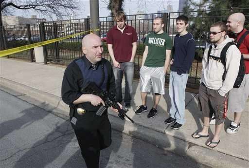 A University of Illinois at Chicago police officer walks with a weapon past students Friday after the school received a report of a possible gunshot near the Student Services Building. Associated Press