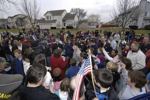 At Lundborg Avenue, Schafer was met by Girl and Boy Scout troops and kids on bicycles for a short parade to his home, past trees and mailboxes adorned with yellow ribbons.