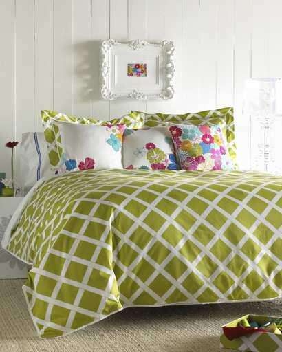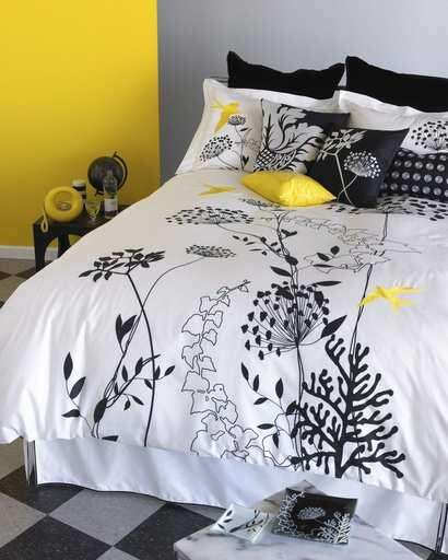 Spring in the city is evoked in Blissliving Home's contemporary bedding ensemble, "Off the Park", which pairs a black and white print with bright yellow. Designer Mei Xu notes the color's "cheerful, optimistic tone. It has the power to bring a smile to your face."
