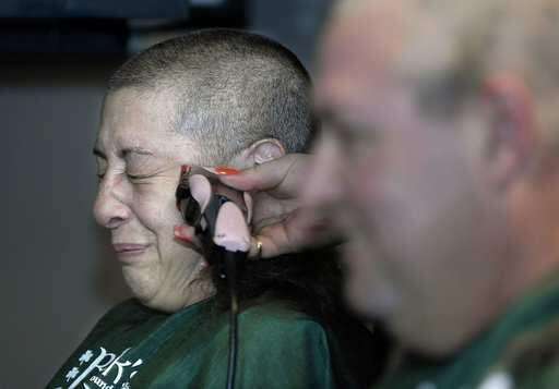"I still look cute, right?" Johnson asked as a volunteer ran clippers across her head, shearing off sections of her reddish brown hair.
