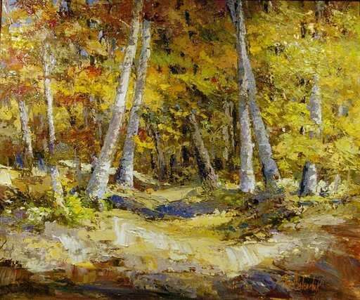 The first place winner is "Northern Woods," an oil painting by Thia Malenchik.