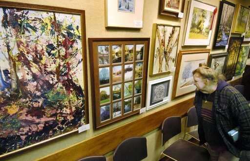 Rita Casello of Elk Grove Village gets a closer look at her favorite piece, "Snow Lady," a pastel made by artist Bonnie Scivally.