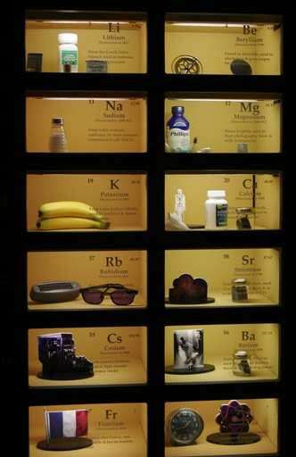 A periodic table exhibit is seen with real-life objects for each element. Associated Press