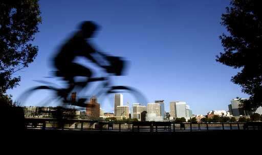 A bicyclist is a blur traveling along the east bank of the Willamette River as the downtown skyline is bathed in early morning sunlight in Portland, Ore. Associated Press