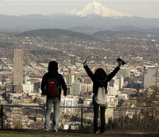 A young couple enjoys the view of Mount Hood looming over downtown on a springlike day in Portland, Ore. Associated Press