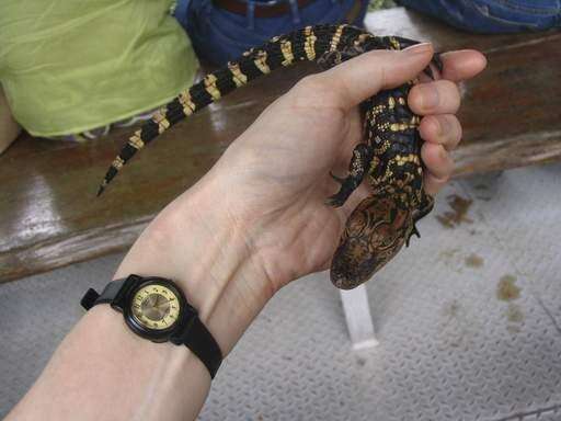 A baby alligator is handled by a tourist on the swamp tour. Associated Press