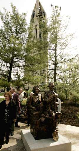 Members of Naperville's Century Walk Corp. gathered Sunday near the Millennium Carillon to unveil the latest installment of its public sculptures, one which displayed an image of the couple.