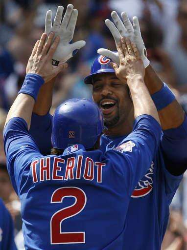 Cubs "slugger" Ryan Theriot greets Derrek Lee at home after Lee hit a fifth-inning grand slam. Associated Press