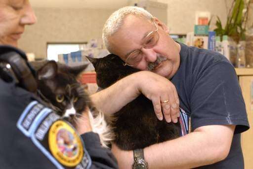 Glen Schallman holds his cat Boo Boo Kitty and Rolling Meadows Community Service Officer Dale Reif holds Schallman's other cat Mew Mew Kitty at the Golf Rose Animal Hospital in Schaumburg Tuesday morning.
