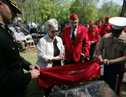 Major Matthew Tracy folds a Marine flag for Nancy Rundle during the The Northwest Suburban Detachment of the Marine Corps League dedication Tuesday in Des Plaines.