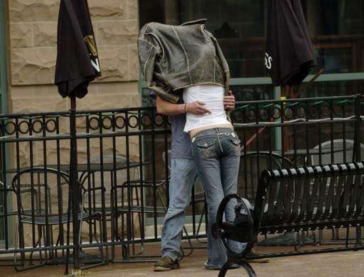 A sure sign of spring, an amorous couple manages to smooch under the safety of a coat during a light drizzle Friday while strolling along Vail Avenue in downtown Arlington Heights.
