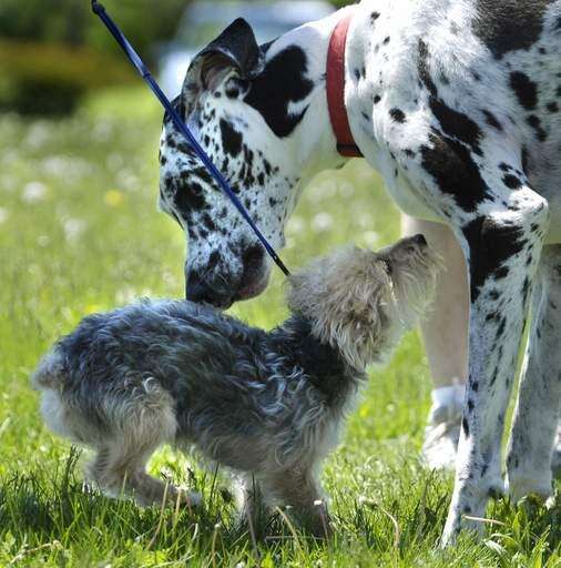 Oliver, a 2-year-old Bishon Friese/Yorkshire Terrier mix, and Amber, a 4-year-old Great Dane, get to know each other Sunday during a Dog Days event at Prairie Meadow Park in West Dundee.