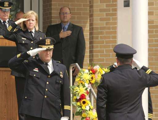 Elgin Police Chief Lisa Womack, top and Deputy Chief Bob Beeter salute Lieutenant Glenn Theriault, right after he lowered the American flag to half-staff during the annual Peace Officers Memorial Service in Elgin.