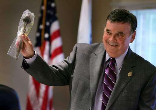 Edward Bender shows off his new gavel before being sworn in as Fox Lake Village President during the village meeting on Tuesday.