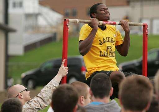 Jacobs High School junior T.J. Brooks strains to complete another pull up during a recruiting visit from the U.S. Marine Corps Monday in Algonquin.