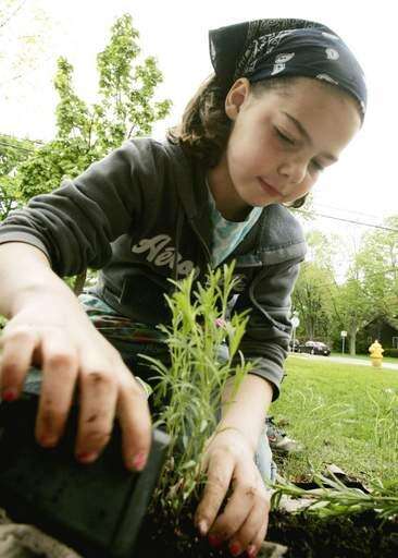 Longfellow school second-grader Kyla Whiting plants flowers in a native butterfly garden in front of the school Monday in Wheaton.