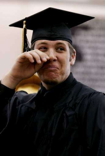 Alex Hanna, 18, pretends to cry as he looks at his mom, Debbie, during the graduation ceremony at Grayslake North High School Sunday. "My mom said she wasn't going to cry during the ceremony," Hanna said, "but I know she is going to cry."