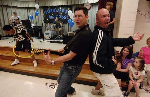 A pumped-up David Sobel is thrilled to be named a Golden Apple winner Tuesday and starts partying with the rest of Hunting Ridge school and Bucket Number 6 band member Chris Wade, left after he was presented with the award.