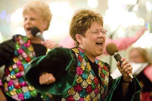 Sally Lynn, right of Hampshire of the New Beginnings Choir in Arlington Heights sings Dancing Queen at Alta Villa Banquets in Addison.