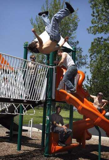 Anton Botiyenko of Buffalo Grove flips off a play set rail while playing "parkour tag" Friday with other Harper Community College students at a playground near the school in Palatine.