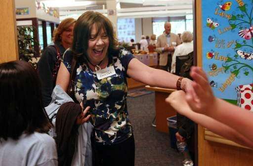 Recently-retired Munhall Elementary School third-grade teacher Glenis Cook is spotted by some former students after an assembly that was part of the school's 50th anniversary celebration in St. Charles Wednesday.