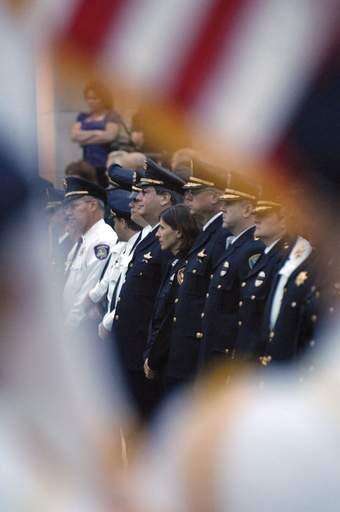 Police officers and sheriffs from the Fox Valley area stand by as the color guard falls into formation Tuesday at the end of the Kane County Chiefs of Police Association's ceremony. The ceremony honoring law enforcement personnel lost in the line of duty.