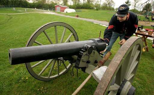 Rob Hauff of Glenview demonstrates the sight for a Civil War cannon as he talks to Fremont Middle School students Monday in Mundelein. The students learned about the Civil War from re-enactors.