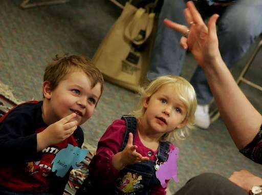 Austin Murrell and Payton Mead pretend to be bees from a beehive during three-year-old reading time at the Lake Villa District Library Wednesday. Youth Services Associate Librarian Sue DeYoung conducted the weekly class.