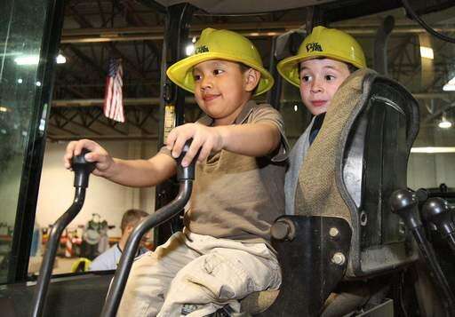 4-year-old Eli Aguirre of Mundelein and five-year-old Sean Land of Ingleside get behind the controls of a giant backhoe during an open house Wednesday at the Vernon Hills Public Works facility.