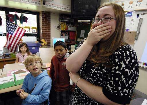 Dryden School teacher Michelle Mangold stands in shock with tears in her eyes after she was presented with a Golden Apple award in her classroom Tuesday.