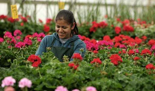 Maria Gonzalez prunes geraniums at Mini Earth Greenhouses in Grayslake Monday. Local nurseries and stores have put out their spring plants as the fear of frost recedes with each warm day.